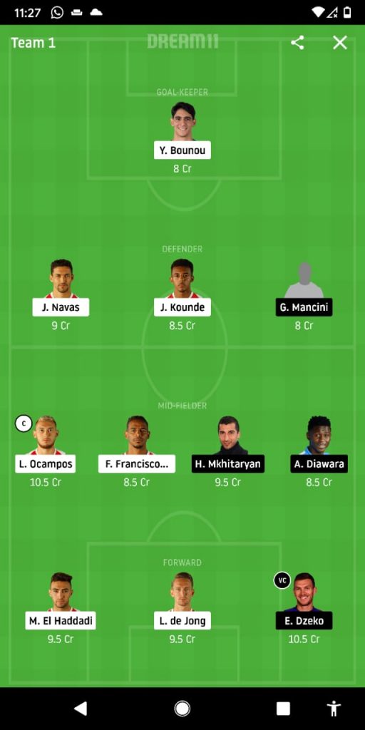 Adding to that defensive resolve is the attacking penchant Jesus Navas has, one which has seen him persistently involve himself in the side’s attacking plays. CB Jules Kounde will partner him up for the outing while AS Roma see us opt for the singular pick of Gianluca Mancini.
