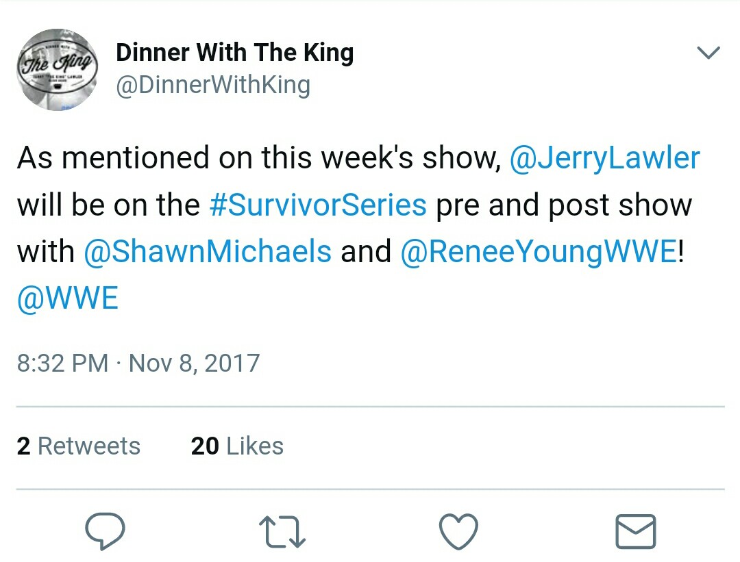 It was revealed on this week’s episode of Dinner with the King that Jerry ‘The King’ Lawler and Shawn Michaels will be appearing on the pre and post-show panels at Survivor Series.
