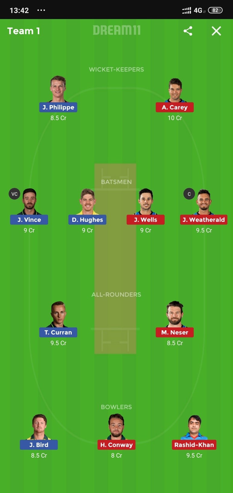 SportsRush Featured Dream XI Team for the Game(Note: C- D Hughes, VC- Rashid khan; image shows wrong captain)