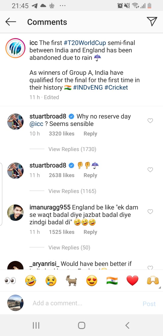 After his country’s shambolic exit, England quick Stuart Broad was quick to express his displeasure with the pacer left perplexed on the ICC’s decision to not allocate reserve days in the eventuality of rain. The bowler took to Instagram to take a jibe at the ICC following the board’s announcement of India making it into the final.