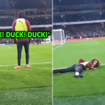 WATCH: Arsenal fans ask Iwobi and Guendouzi to duck for clear view of Auba’s penalty; duo respond