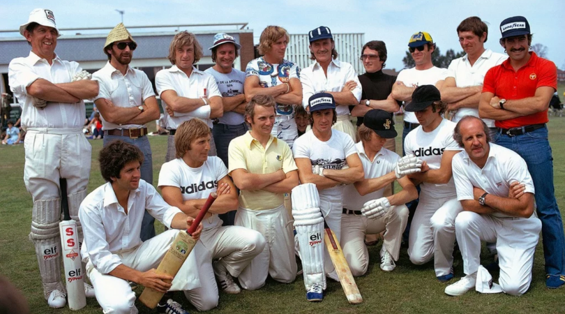 In a rare photo that has surfaced on social media today, one can see the drivers from 1974 being pictured in cricket kits for their game agains Prince Charles.
