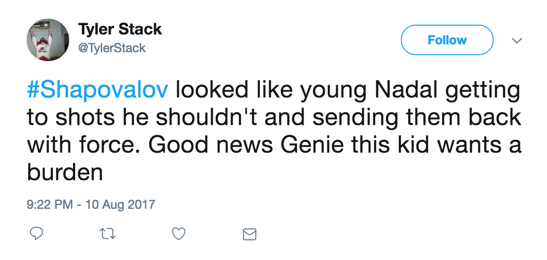 Nadal and Shapovalov exchanged breaks in the 2nd set, but the Junior Wimbledon Champion was able to hold his nerve and serve out the set, 6-4.