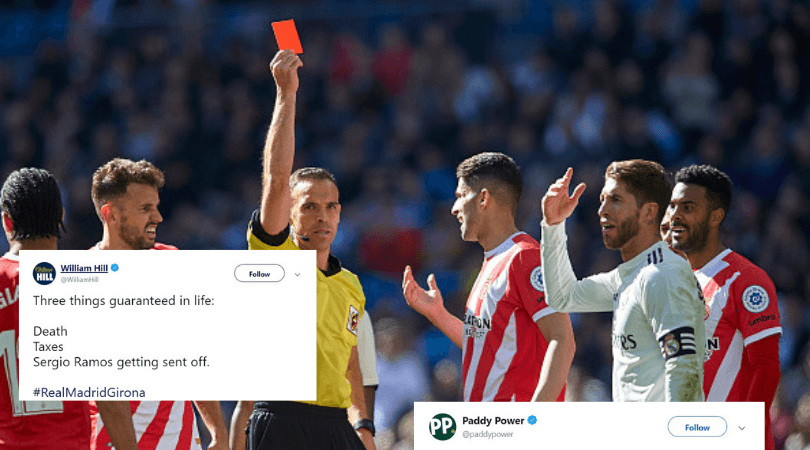 Sergio Ramos getting sent off.#RealMadridGirona pic.twitter.com/l0Vx3x6JxA— William Hill (@WilliamHill) February 17, 2019