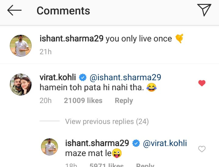 Kohli allowed Indian Cricket fans a peak into his good-natured banter with his teammates on social media when he trolled Ishant Sharma after he posted a picture of himself on Instagram. The Delhi duo left the fans on the floor with their conversation.