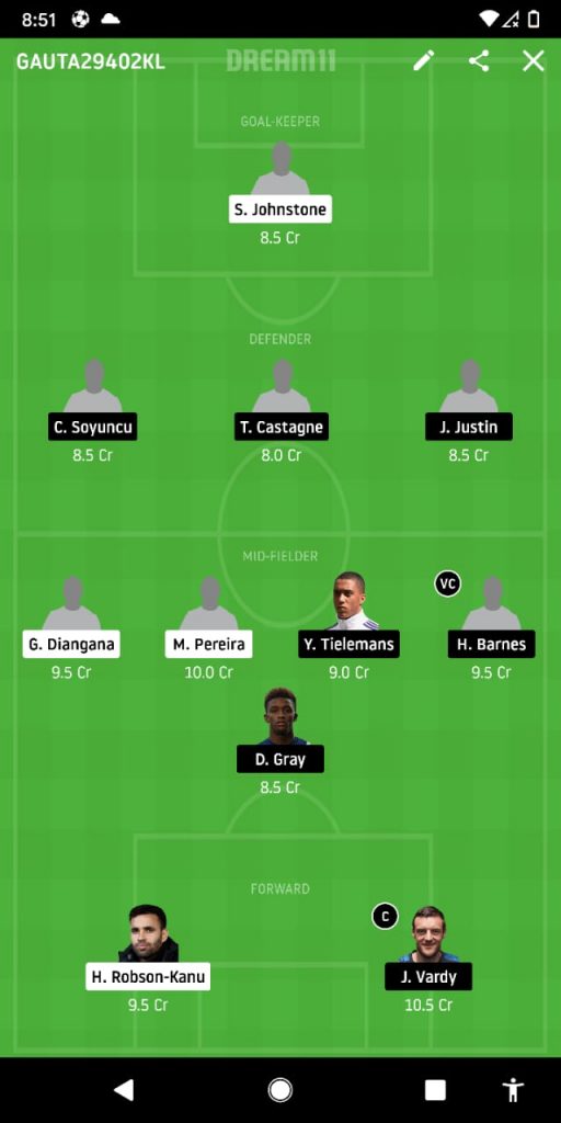Schmeichel, Justin, Ndidi, Soyuncu, Castagne, Gray, Tielemans, Mendy, Praet, Barnes, Vardy