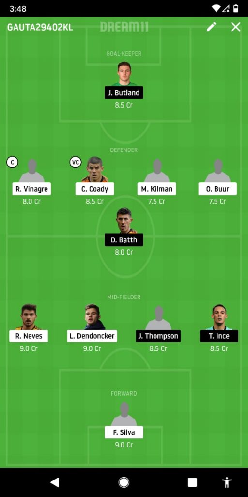 Given the likelihood of a cleansheet for Wolverhampton today, wingback Ruben will captain our side while Coady is the vice-captain.