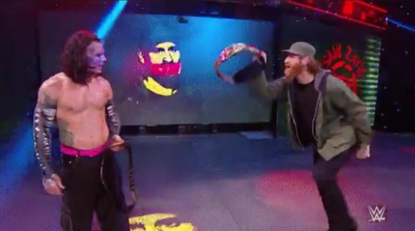 Jeff Hardy limped up the ramp after his victory. To his and all the viewers’ surprise, Sami Zayn walked out from behind. Zayn danced around Hardy with the old Intercontinental title in his hand while claiming to be the real champion.