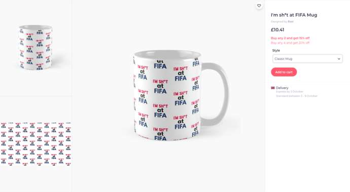 Perhaps your friend isn’t very outgoing or wouldn’t want to wear the shirt in public. Well worry not, redbubble also has ‘I’m sh*t at FIFA’ mugs, priced at £10.41.